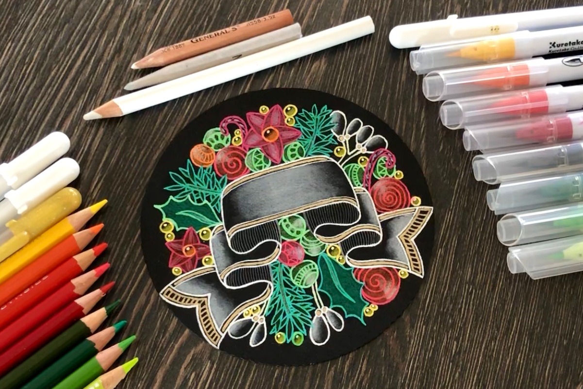 The focal point of this design is the beautiful banner, which is not really Zentangle- related but I believe that it’s the perfect addition to the design. Also, although seemingly complex, it’s easy to practice and learn. My intention was also to find fun and festive-looking tangles that could be used for making of Christmas cards but you can certainly use any tangles to make cards for any other occasion.
