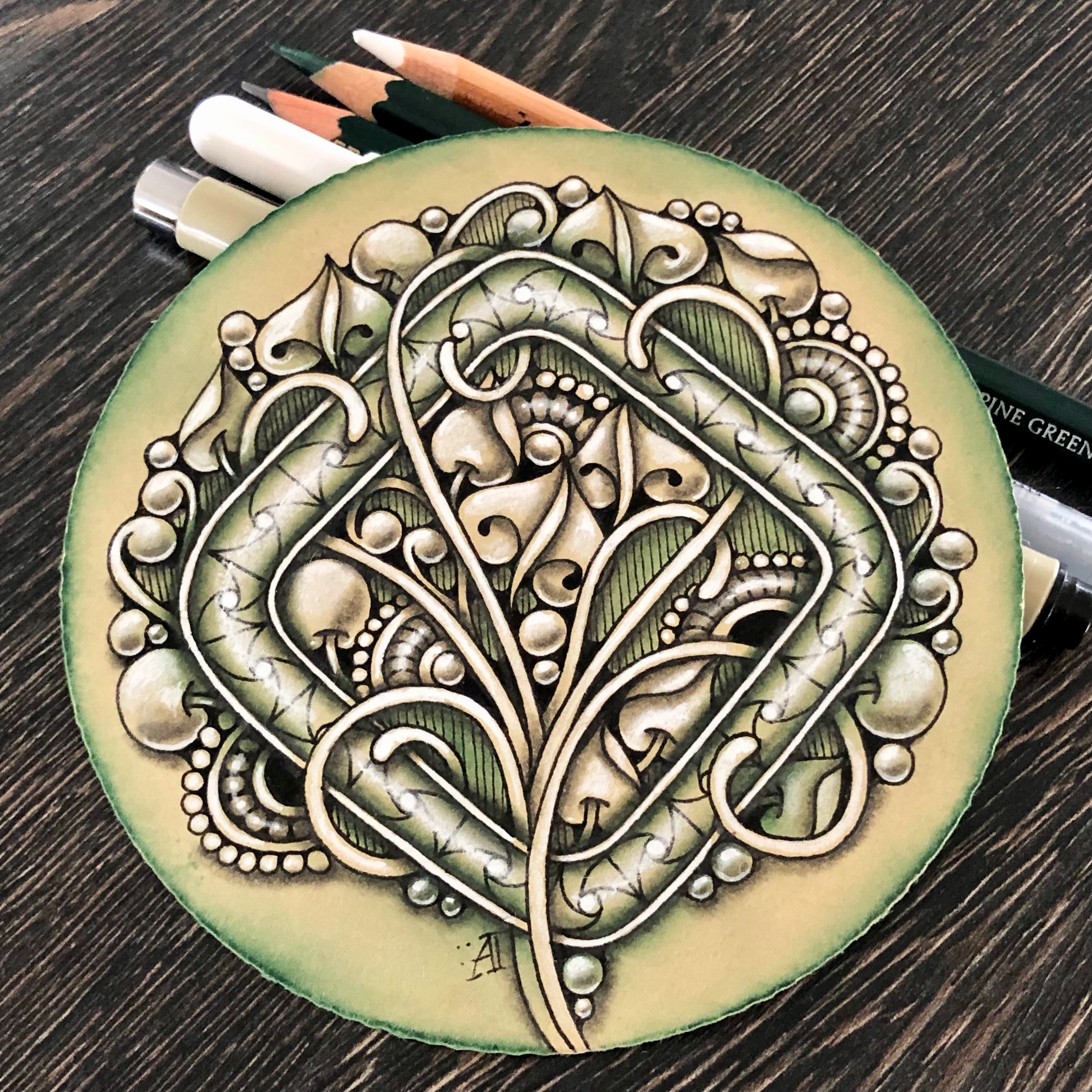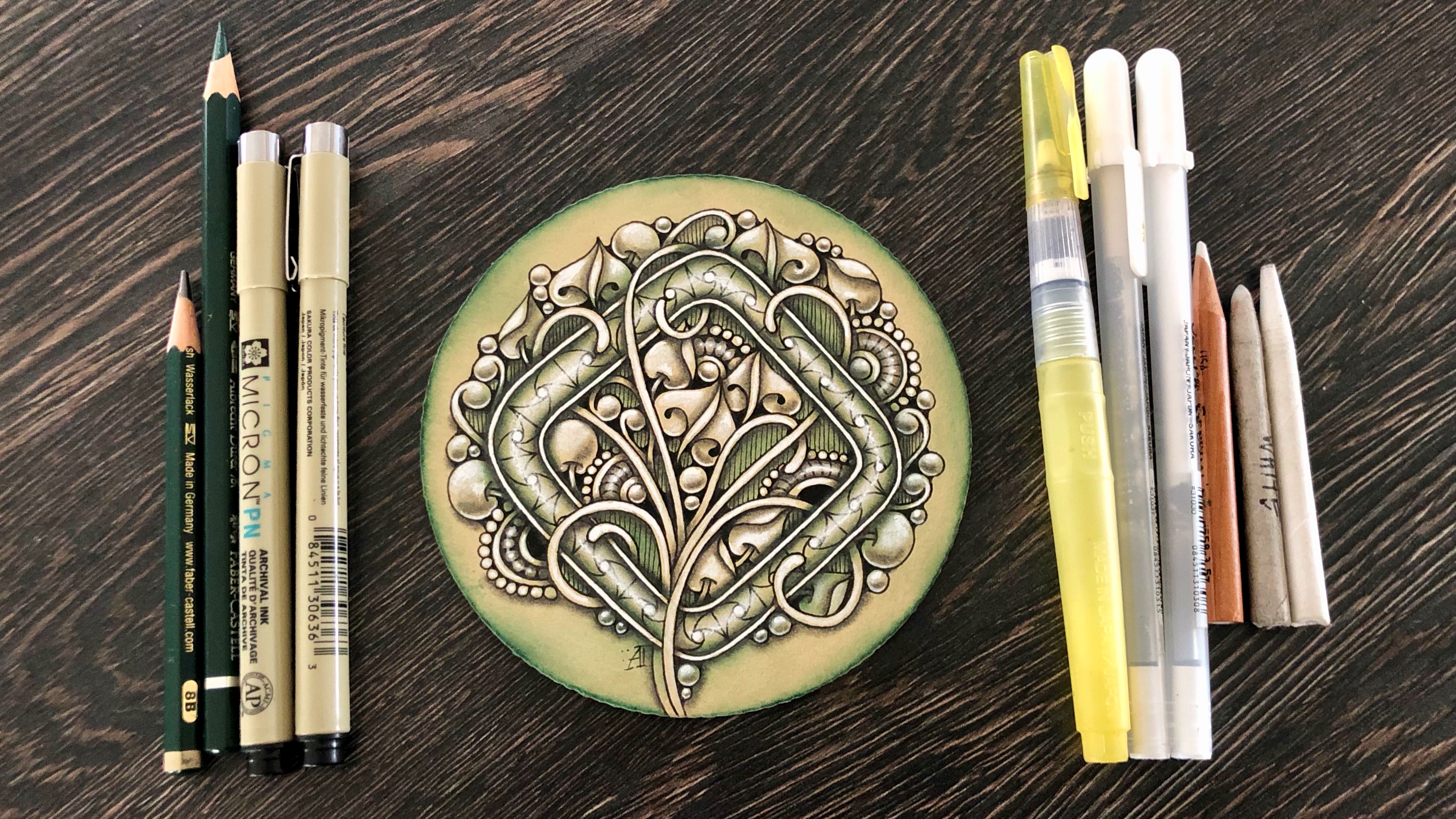 This elegant and organic design combines a frame with floral tangles. The curvy branches are entangled with the square frame and surrounded with other botanical-looking tangles. It might seem complex, but only until you learn a simple approach and let your imagination create new examples.
