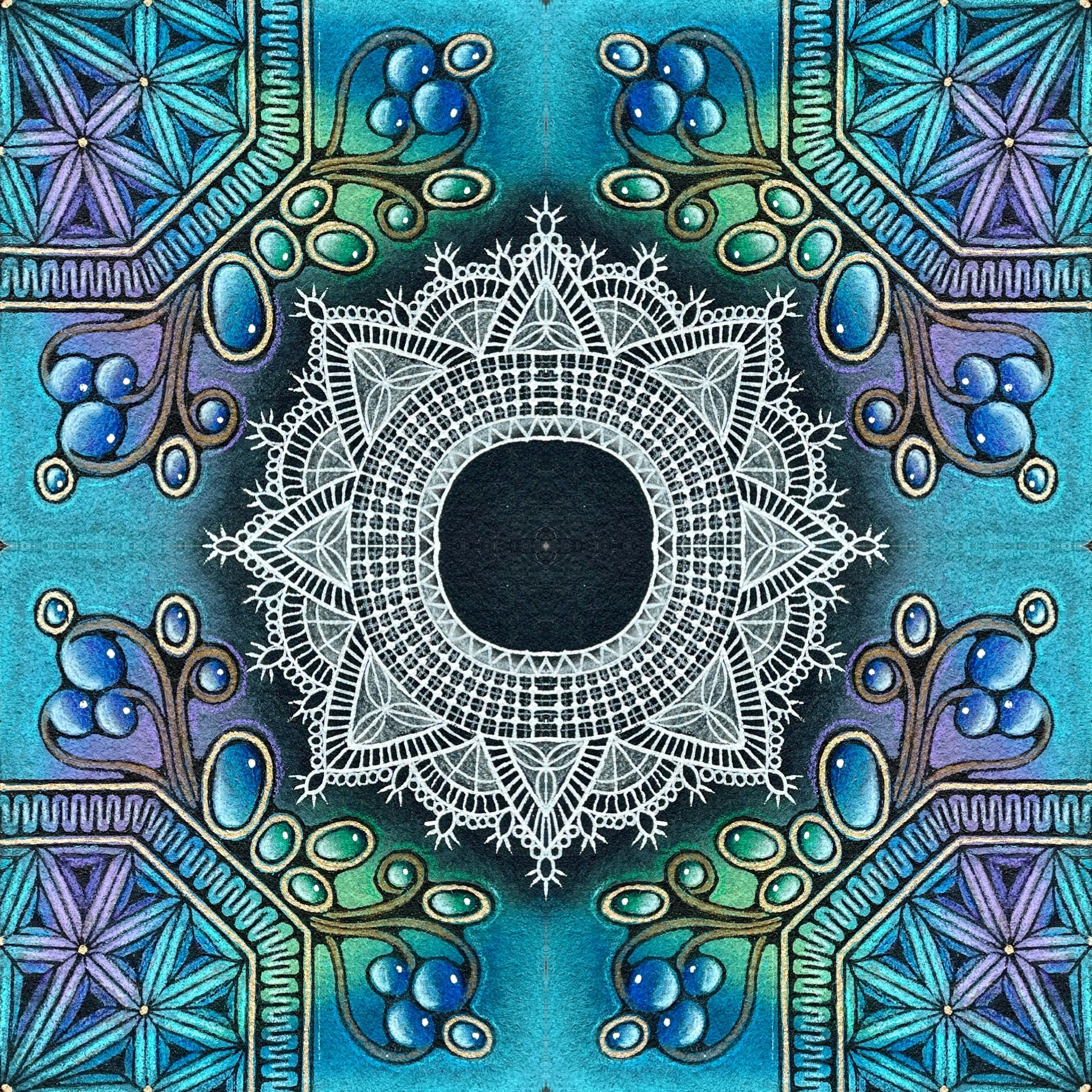 Combine exciting supplies and elements on black background - string, tangled lace, glowing tangles. Draw a single tile and learn to use free phone apps to create different mosaics. Get a video class with unlimited access (total length 1h 46m) and an eBook with instructions.