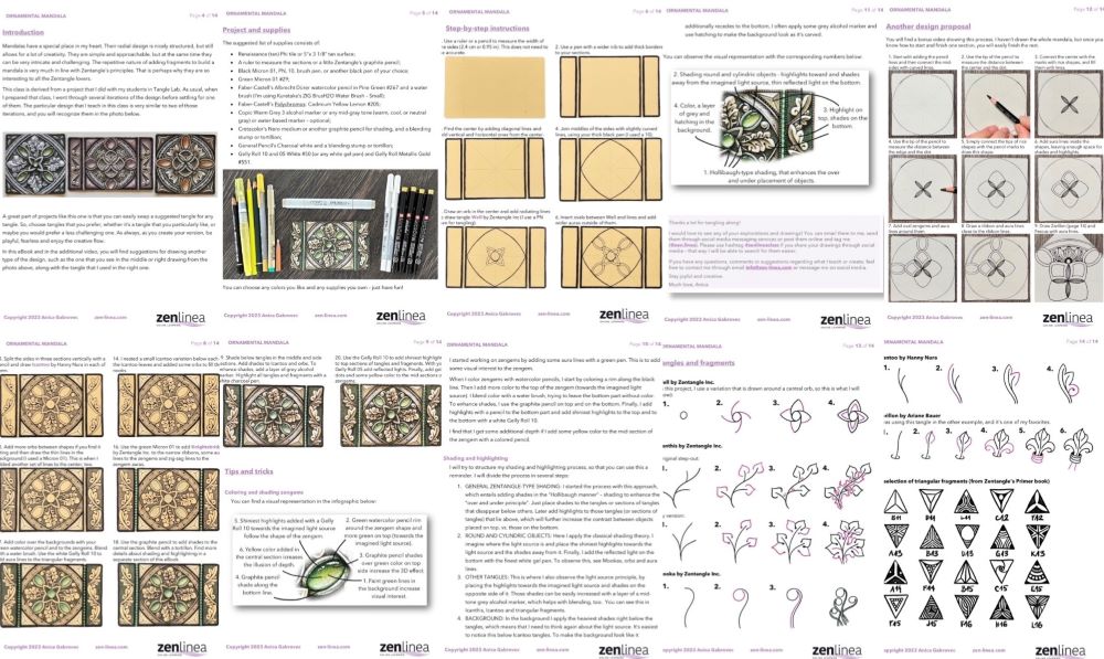 The complimentary PDF eBook is a comprehensive resource that you will be able to use while you're working on the project or as a future reference to create new intricate pieces. It contains screenshots with steps to completing the project, step-outs for the tangles used, a guide to designing an additional mandala, tips, and tricks for drawing zengems, coloring, shading, and highlighting Zentangle-inspired artwork, etc.