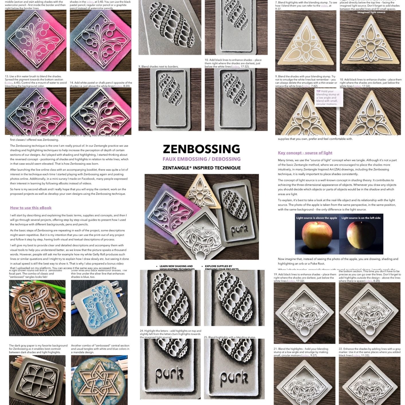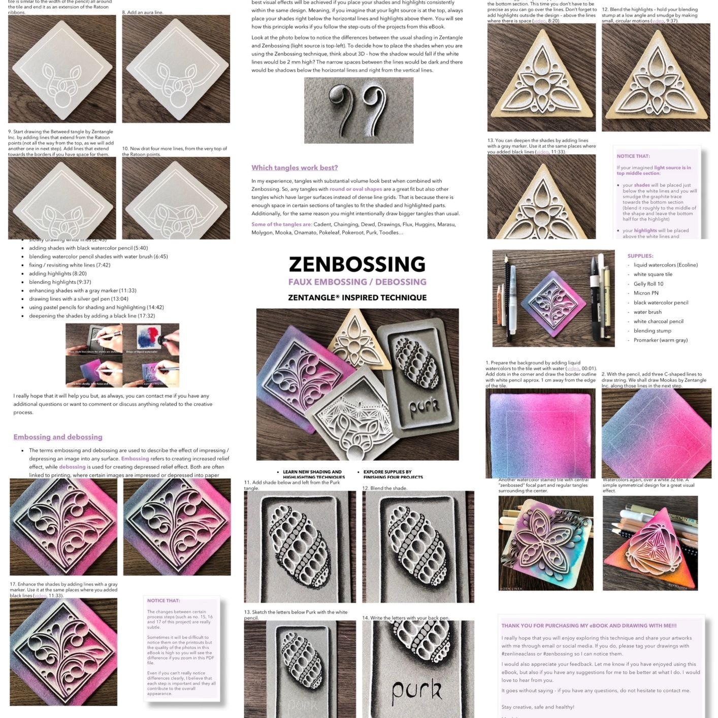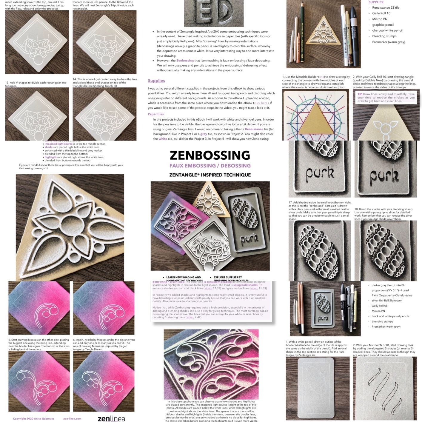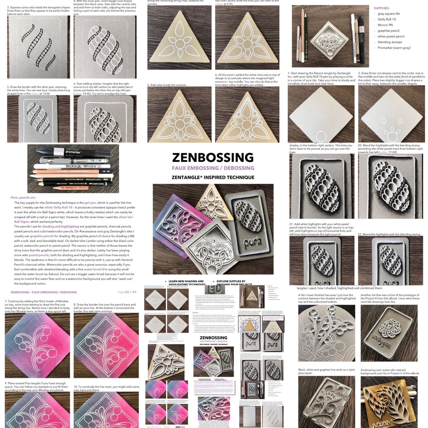I am happy to present the step-by-step guide to learning the Zenbossing technique and finishing 4 projects that feature different backgrounds, supplies and tangles. It will enable you to learn the technique at your own pace and encourage further creative explorations.
